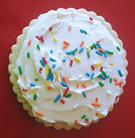 This is a large, thick, soft vanilla almond cookie with creamy buttercream made with only real butter! Topped with colorful sprinkles, this cookie is a real crowd-pleaser!